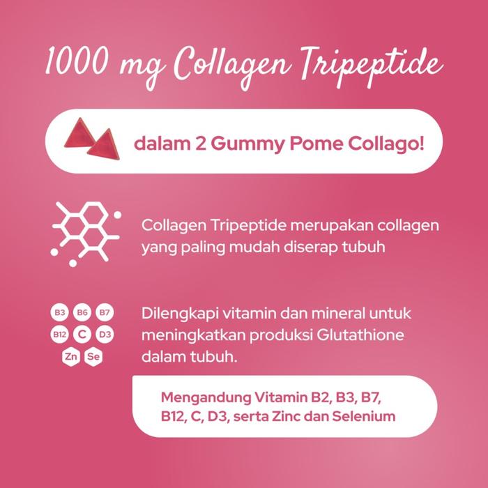 Pome COLLAGO adalah gummy suplemen kolagen yang mengandung 1.000 mg Kolagen Tripeptida per sajian, dilengkapi dengan vitamin dan mineral untuk meningkatkan produksi Glutathione alami dalam tubuh. Formula ini membantu: