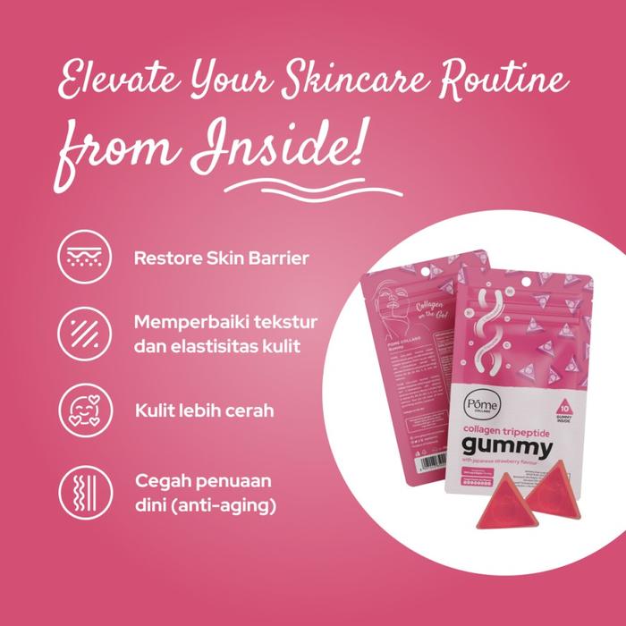 Pome COLLAGO Gummy adalah suplemen superfood berbentuk gummy yang mengandung 1.000 mg Kolagen Tripeptida per sajian, serta dilengkapi dengan berbagai vitamin dan mineral untuk meningkatkan produksi Glutathione alami dalam tubuh. Manfaat utamanya adalah: