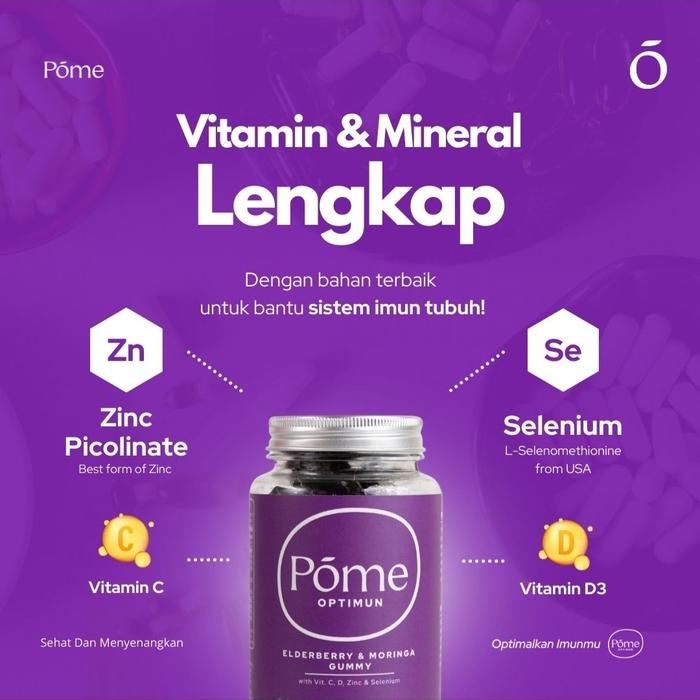 Perkenalkan Pome Optimun, Functional Food Gummy pertama di dunia yang menggabungkan kekuatan peningkat imunitas dari Ekstrak Elderberry dan Daun Kelor, diperkaya dengan Vitamin C, D3, Zinc, dan Selenium. Dilengkapi dengan rasa segar minty blackcurrant, produk ini dirancang untuk kamu yang aktif, membantu menjaga kesehatan agar tetap beraktivitas tanpa khawatir jatuh sakit.